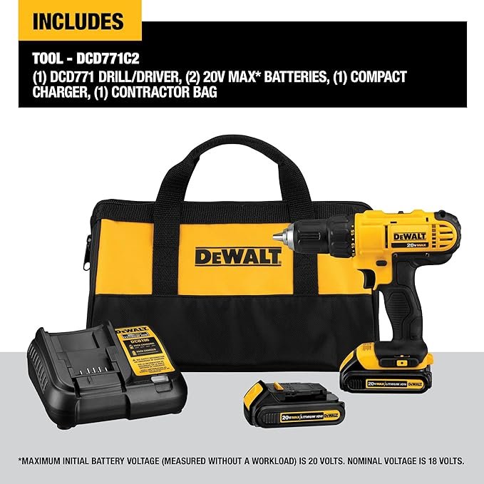 The DEWALT 20V MAX Cordless Drill/Driver Kit (DCD771C2) delivers the perfect balance of power, performance, and portability. Engineered with a high-speed motor producing up to 300 UWO, this DEWALT 20V MAX Cordless Drill/Driver Kit handles a wide range of drilling and fastening applications with ease. Its two-speed transmission (0–450 and 0–1,500 RPM) allows for precision control on wood, metal, and plastic.