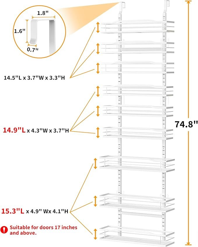 Over-the-door pantry organizer designed to maximize space with a 9-tier metal rack that hangs easily over any standard door. Perfect for storing spices, canned goods, toiletries, or laundry supplies, this rust-resistant steel organizer installs quickly with no drilling. Upgrade your home storage with sleek, functional organization today!
